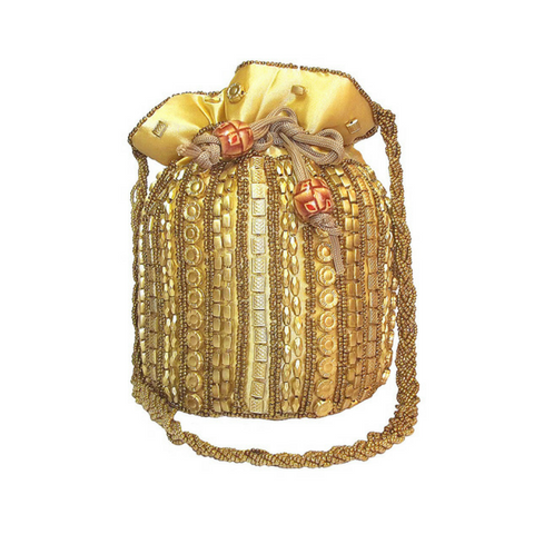A pretty Designer Potli Bag -Gold for your stylish ethnic wardrobe. Potli handbags adds elegance to your traditional outfits like lehenga choli, saree, gaghra choli etc… They are equally good with any casual Indian wear. These Potli bags are good for evening parties or some special occasions like wedding, temple and festivals. They are made with silk, hand embroidery and beadwork.
