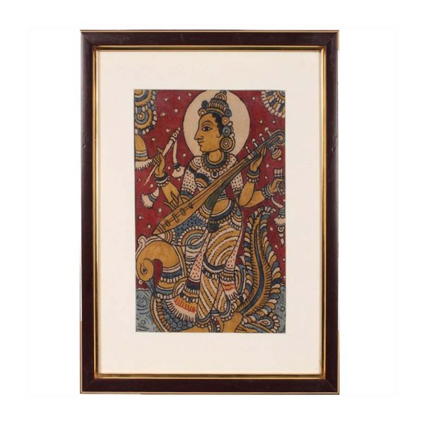 This Kalamkari Painting of Lord Saraswathi with frame has been hand-painted in natural colors. Saraswathi with frame features the Hindu goddess of knowledge, music, arts and science. She rides on swan, which is indicative of inquisitiveness.