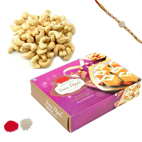- The Rakhi With Kaju And Soan Papdi is a collection of Rakhi, kaju and a soan papdi box and haldi in a creative arrangement.